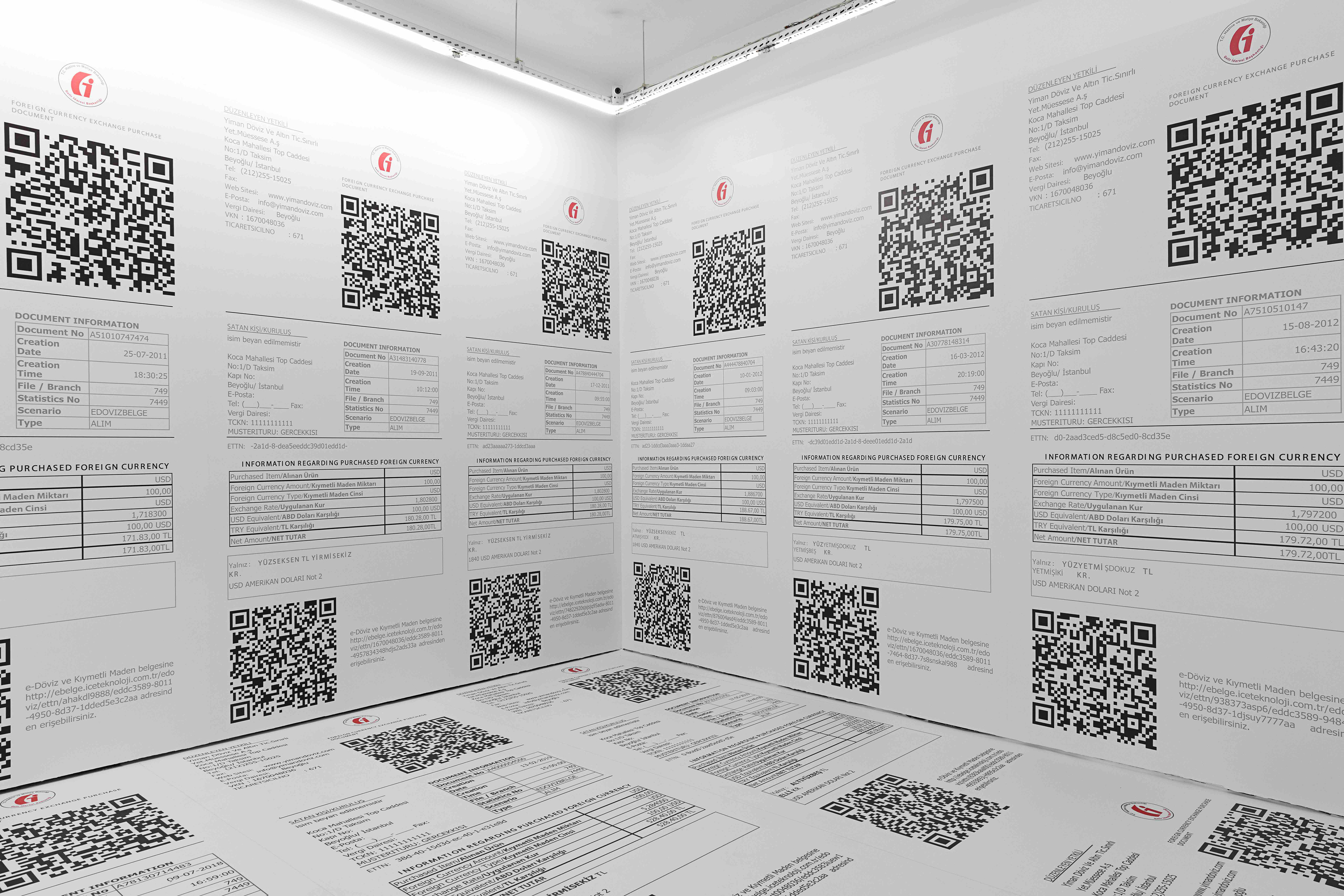 Justice & Development Party / Weather Report, 2026 Installation with enlarged financial receipts and QR-linked historical weather data