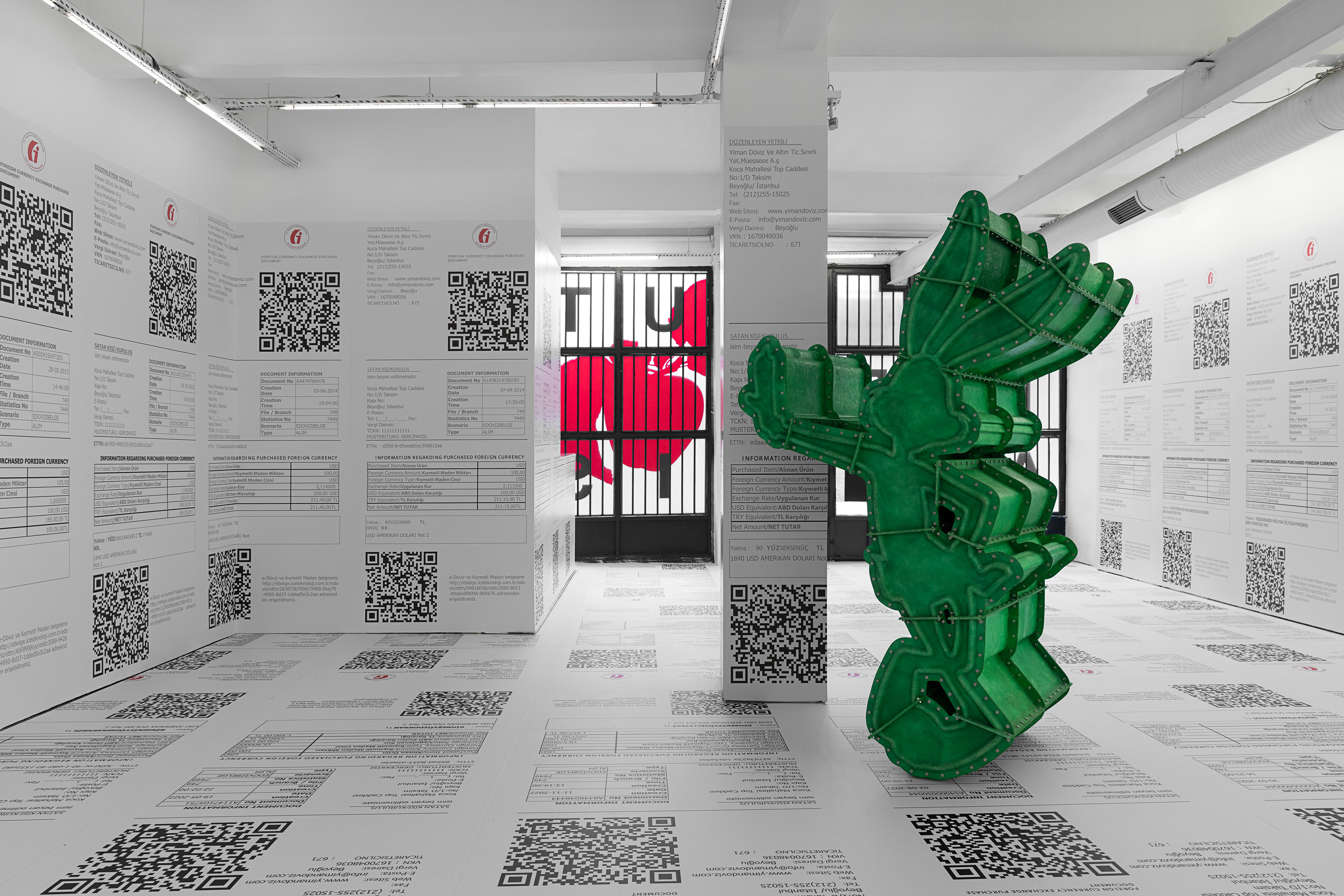 ABOUT THE ARTIST turns the gallery space into an immersive and interactive environment where a single monumental sculpture stands alone against a backdrop of currency exchange records and real-time data flows. Operating at the intersection of financial transactions, currency value, weather reports, and wind patterns, the exhibition puts on display the recent history of dispossession in Turkey through the evolution of currency exchange rates of the last 24 years, re-imagined as an evolving climate. It also marks a third iteration in a series of conceptual propositions by Irem Günaydın, bringing into play transformed elements from her previous two solo exhibitions at the gallery.