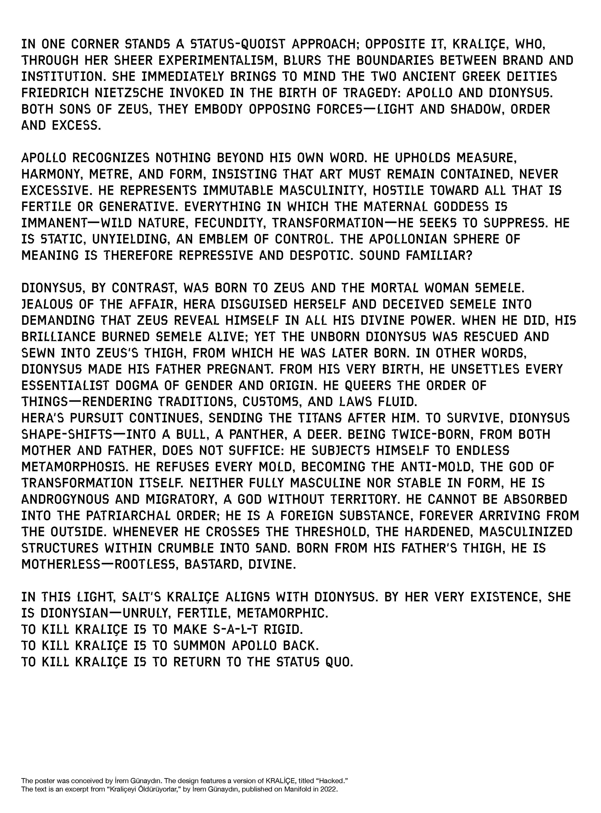 The back of the poster featured an excerpt from my 2022 essay Kraliçeyi Öldürüyorlar, originally written in response to the discontinuation of SALT’s experimental identity system. In that text, I draw on Nietzsche’s distinction between the Apollonian and the Dionysian to position “Kraliçe” as a Dionysian figure -excessive, metamorphic, resistant to rigidity and institutional fixation.